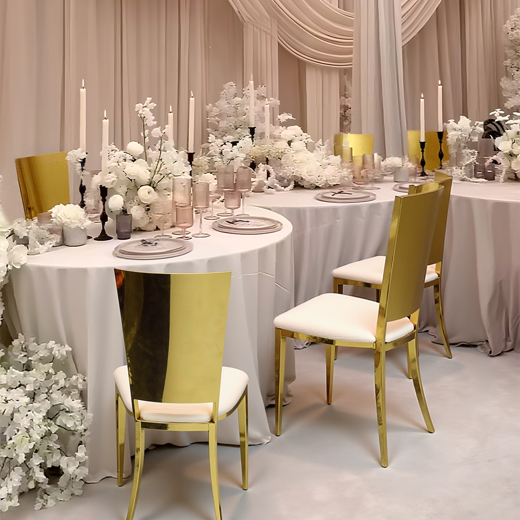 Moderní luxusní jídelní židle pro akce, zlatý rám z nerezové oceli, vhodné pro svatby, akce, restaurace, hotely, design pro nevěstu a ženicha
