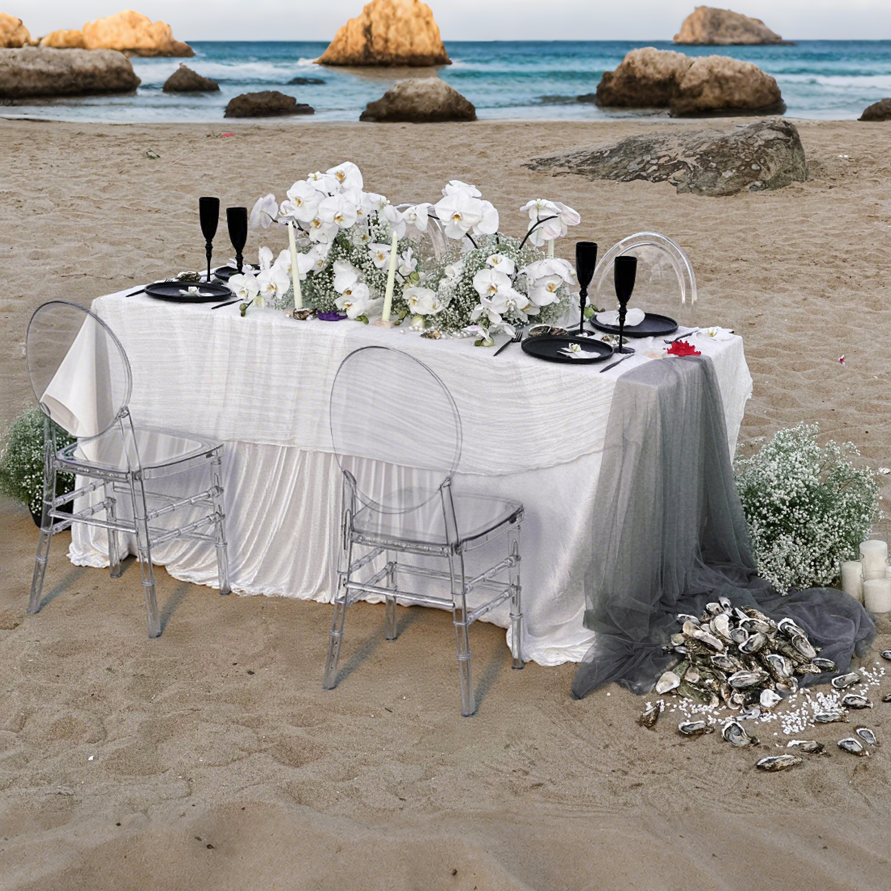 Průhledný kristalově čistý design umožňuje židli doplňovat různé prostředí akcí, včetně svateb, banketů a oslav. Moderní design ji činí vhodnou jak pro interiéry, tak pro exteriéry.