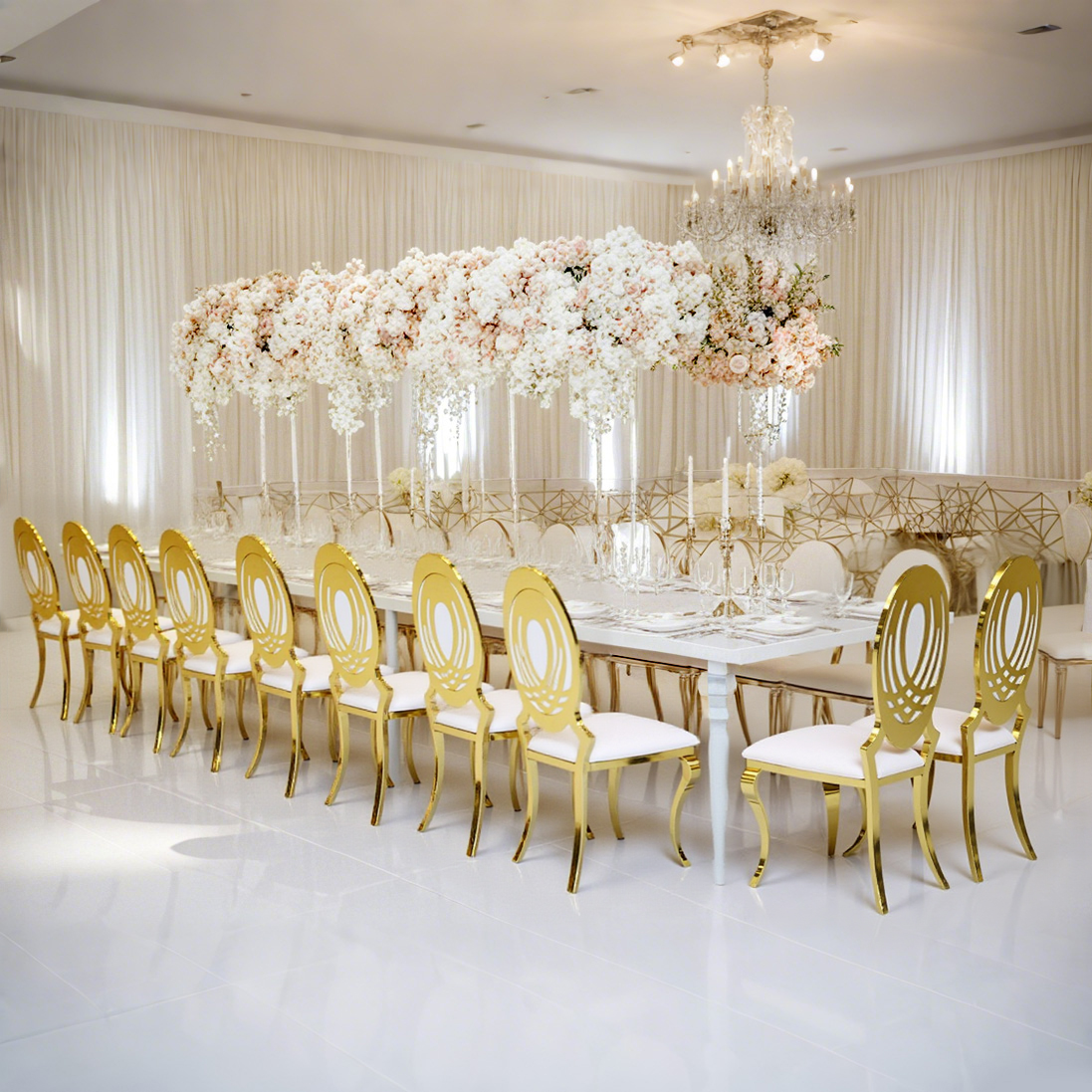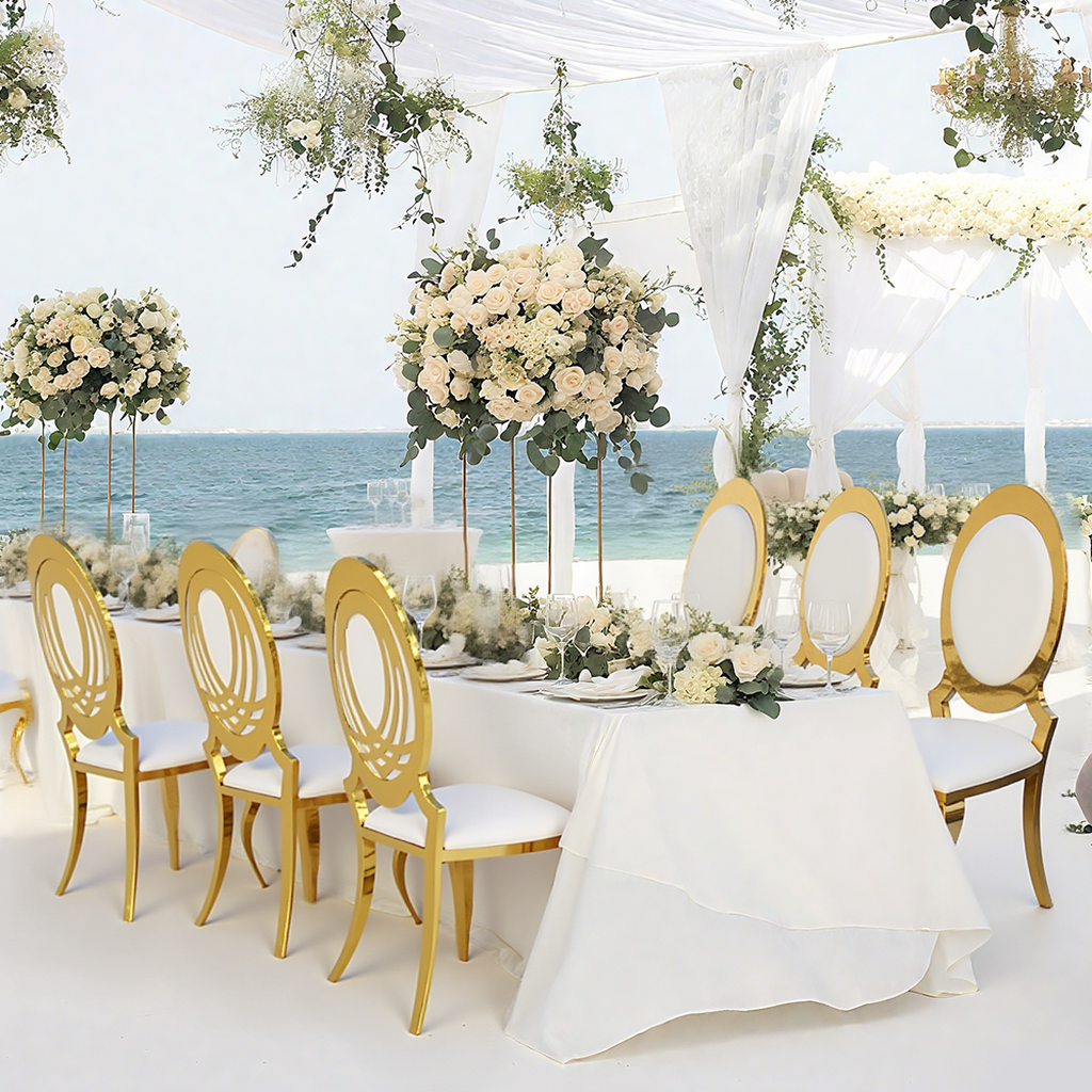 लक्ज़री यूरोपीय गोल्ड स्टेनलेस स्टील डाइनिंग चेयर घर वेडिंग इवेंट्स बैंक्वेट्स-होटल फर्नीचर के लिए
