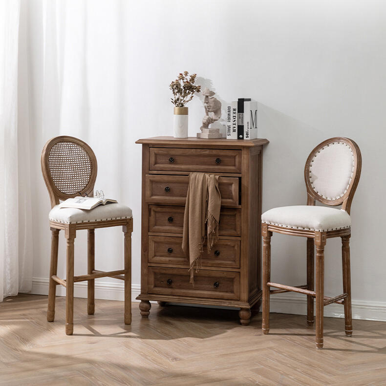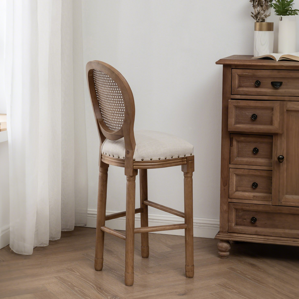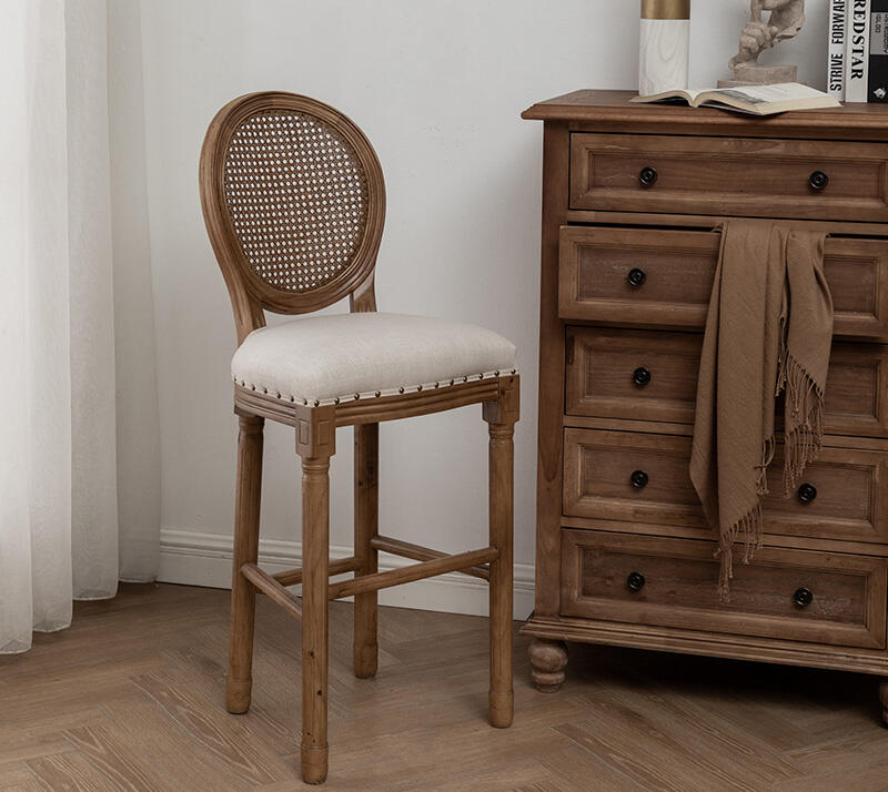 High Back Leather Bar Chairs Rattan Wood Metal Frame Counter Height Traditional Design for Home Kitchen Dining Outdoor