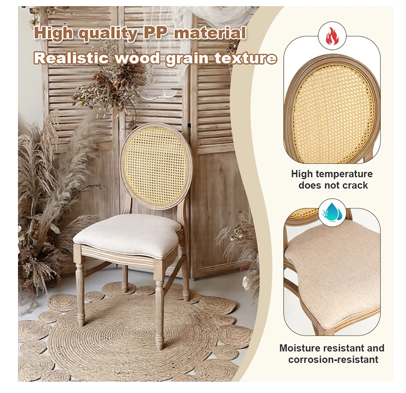 product antique modern imitation wood grain event chair rustic rattan metal pp stackable for outdoor dining hotels bars weddings637-0