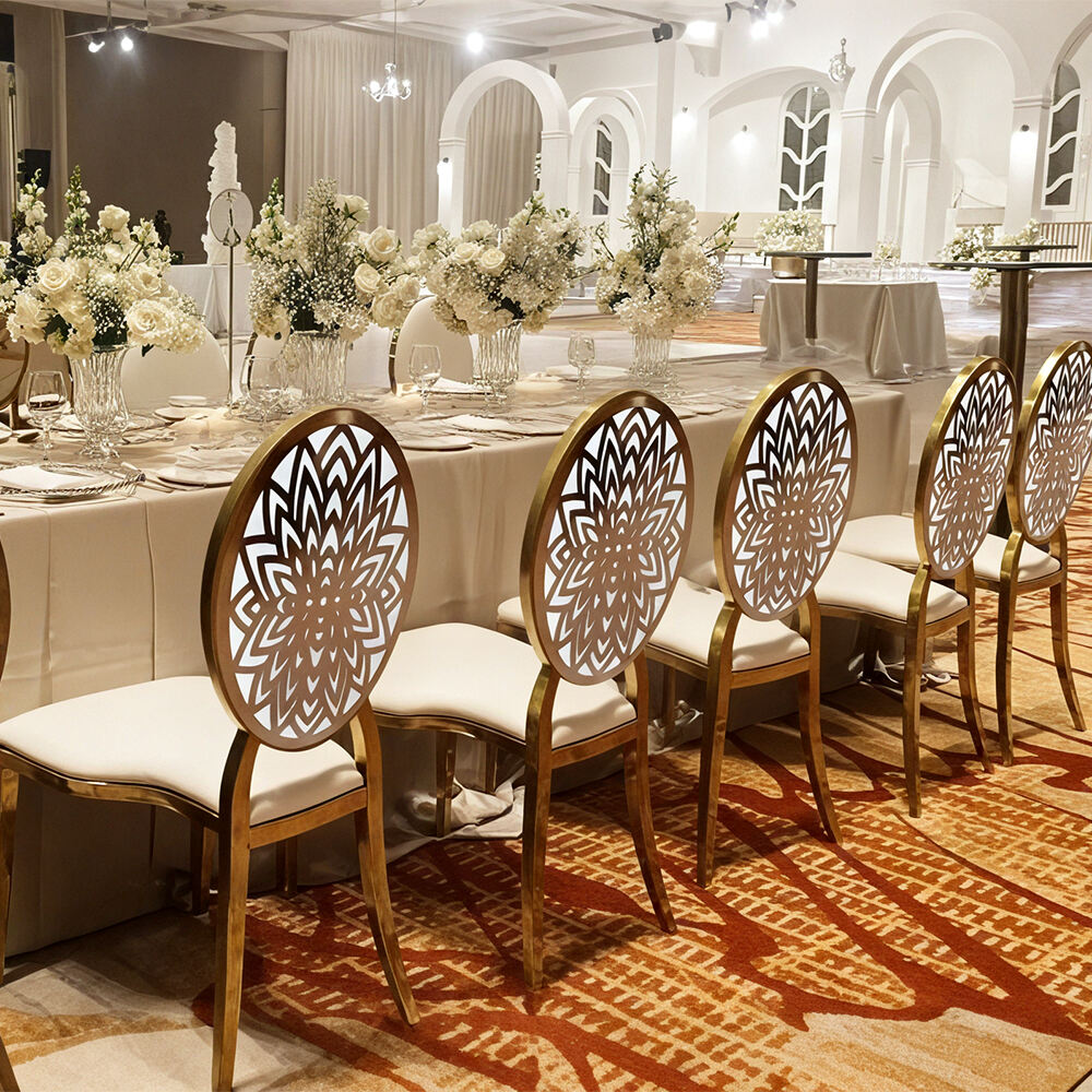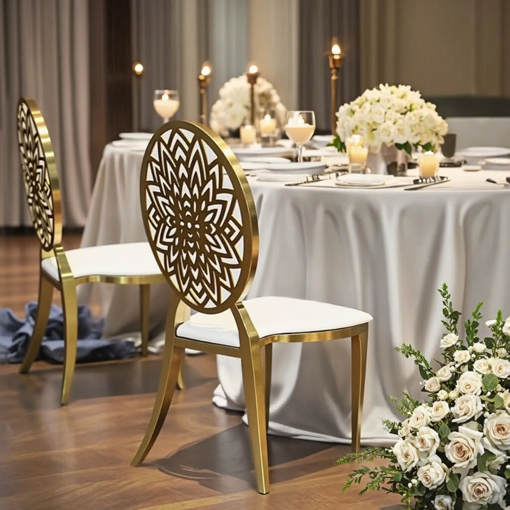 Kipande cha Mzinga cha Chuma cha Kistaheli cha Dhahabu cha Pande za Kulia cha Uzuri wa Louis kwa Ajili ya Matukio, Hoteli, Banketi na Viti vya Harusi vyenye Muvua Mzuri wa Nyuma kwa Ajili ya Ukumbi wa Kupokea