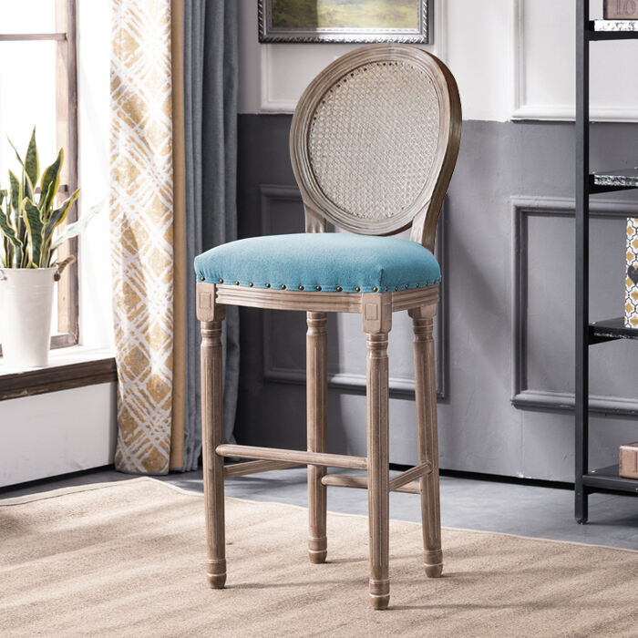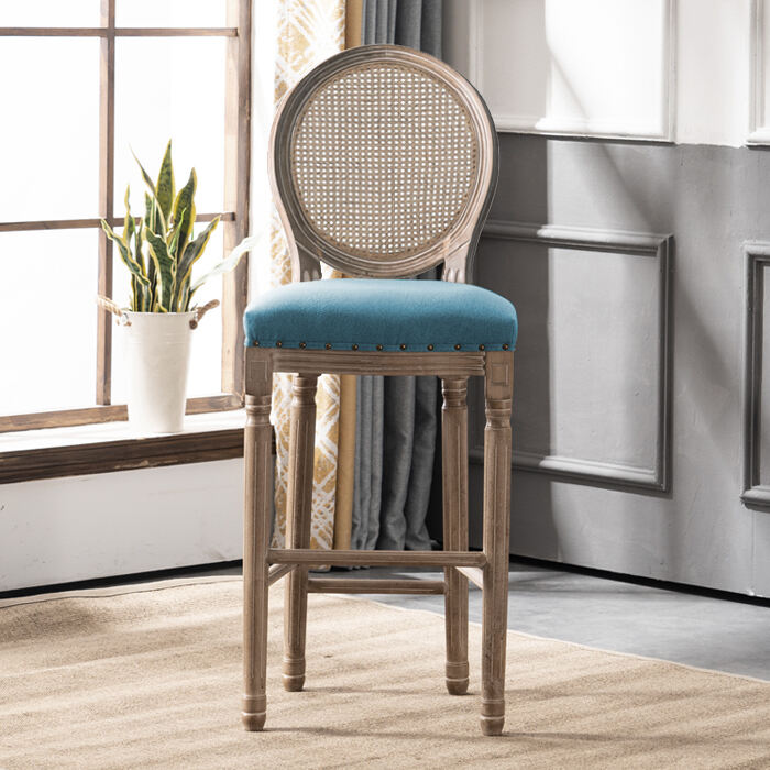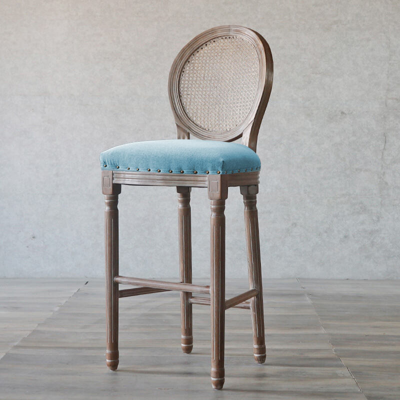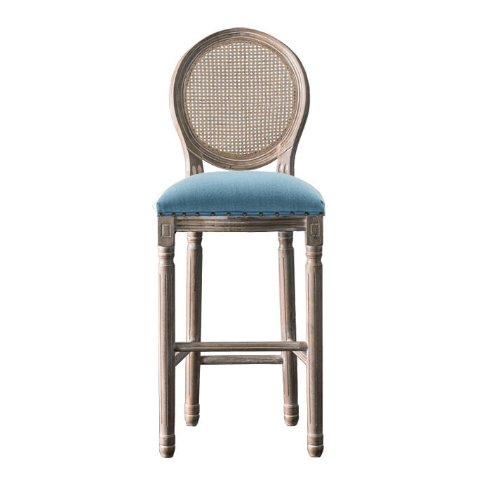 పాతపండు ఆధునిక ఘన చెక్క బార్ స్టూల్ ఇంటి వంటగది పెళ్లి హోటల్ కొరకు ఎత్తైన చెక్క కాళ్లతో, మన్నికైన రబ్బర్ చెక్క పత్తి లినెన్ రాటన్